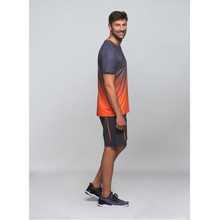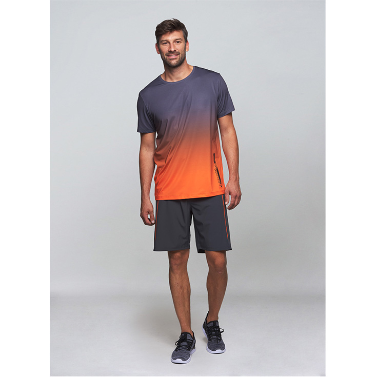 Veshje e përditshme, me material të ajrosshëm, me gradient ngjyrash nga gri në portokalli, mund të bëhet aksesori kryesor për të gjitha llojet e sporteve.