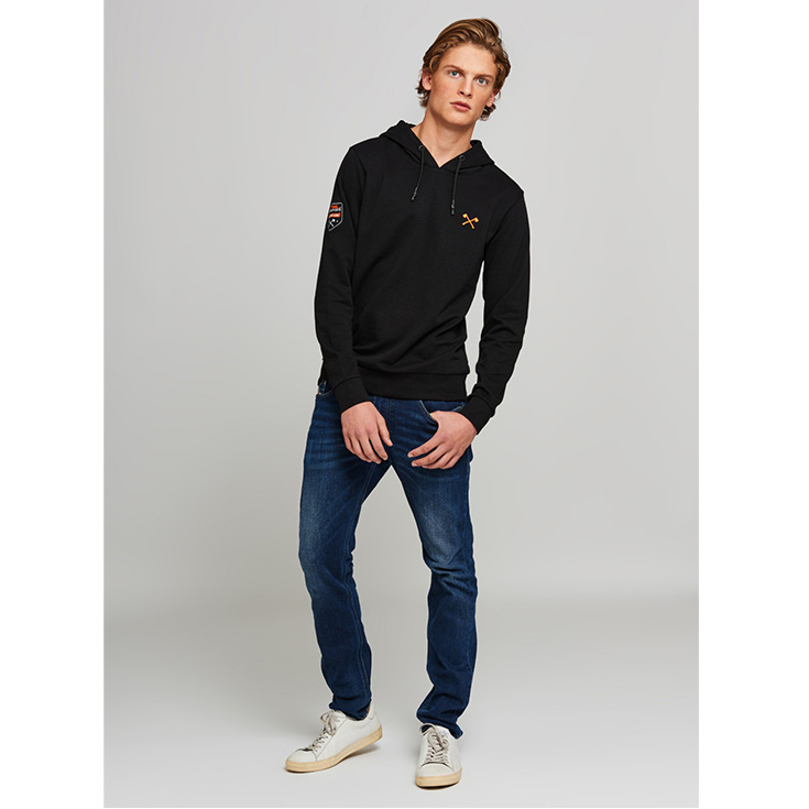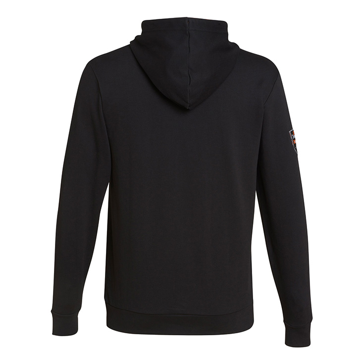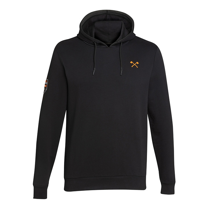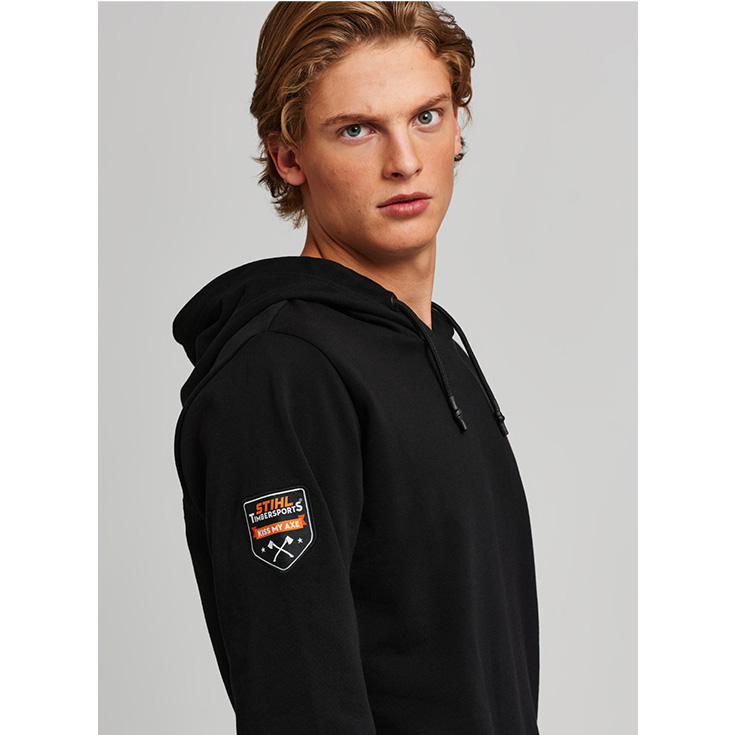 Bluzë e rehatshme me kapuç, rripa lidhës dhe vrima metalike në qafë. Detajet e STIHL TIMBERSPORTS®:logo me qepje në mëngë dhe stampim në pjesën e brendshme, ndërsa në pjesën e gjoksit sëpata të kryqëzuara, me printim në ngjyrë portokalli mbi të zezë. Kapuçi rrethohet nga një rrip në ngjyrë portokalli.