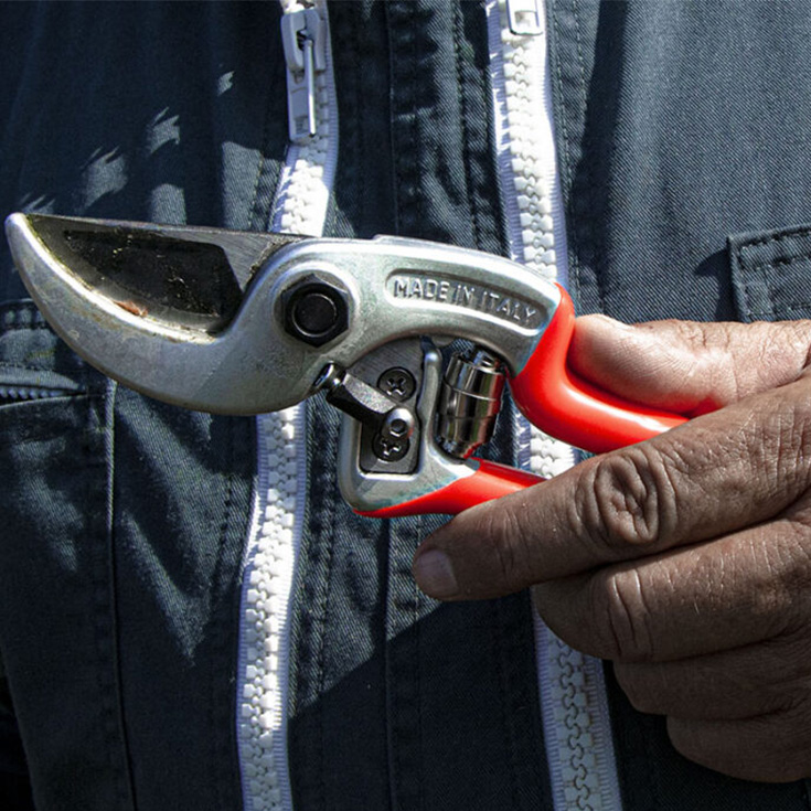Gërshërë profesionale me ndalesë të lakuar që ju lejon të mbani degën të palëvizshme gjatë prerjes, duke shmangur goditjen në kyçin e dorës. Doreza është universale, e përshtatshme për përdoruesit e djathtë dhe të majtë. Doreza dhe kundër-tehu në aliazh alumini të lehtë janë të farkëtuara në nxehtësi, trajtimi i sipërfaqes me oksidim anodik lejon rezistencë më të madhe me kalimin e kohës. Tehu i çelikut me një përqindje të lartë të karbonit është i farkëtuar në nxehtësi. Zgavra në teh zvogëlon përpjekjen e nevojshme për prerje sepse rrit depërtimin në degë. Si të gjitha mjetet e krasitjes me dorë, ai është plotësisht i këmbyeshëm dhe i rregullueshëm.