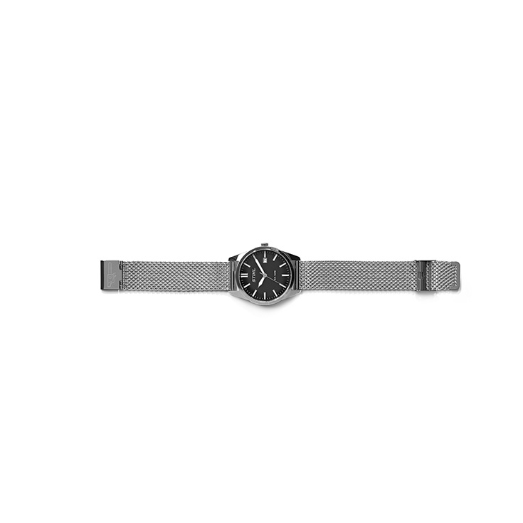 Ora e dorës STIHL, e prodhuar nga firma Jacques Lemans, është matës kohe tradicional në design klasik. Kasa masive prej çeliku të fortë ka një diametër 40 mm, fusha e numrave me ngjyrë të zezë, treguesi i datës në pozicionin e orës 3 janë të thjeshta, por shumë të dallueshme. Ky model ka mekanizëm kuarci, formë të rrumbullakët dhe shtresën e poshtme të fiksuar me vida, xhami mbrojtës i markës Crystex dhe është rezistente ndaj ujit deri në 10 ATM. Rripi i orës përbëhet nga çelik i fortë inox i lëmuar. Kjo orë dore është bashkëshoqërues i përsosur për çdo ditë.